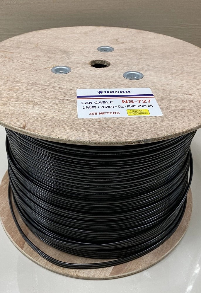 Dây mạng 4 lõi + POWER VỎ LDPE MỀM CHUYÊN DỤNG NGOÀI TRỜI Cat5e NASUN NS-727 ĐỒNG NGUYÊN CHẤT + DẦU + FILM CHỐNG NHIỄU + Nhiều SỢI THÉP GIA CƯỜNG bện chặt, (Hàng chuẩn 305m/cuộn gỗ) - Đường kính lõi 0.53mm ĐỒNG NGUYÊN CHẤT TỰ NHIÊN + CÁP NGUỒN 2C*14/0.20mm Đồng nguyên chất tự nhiên