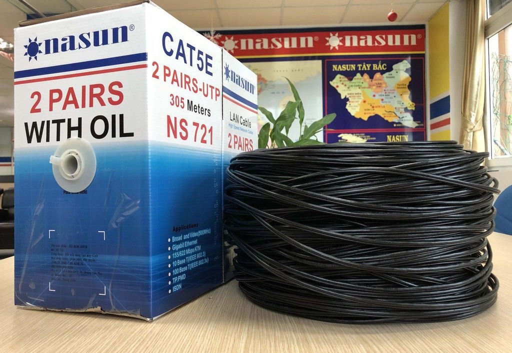 Dây mạng 4 lõi VỎ PE CỨNG NGOÀI TRỜI Cat5e NASUN NS-721 NHÔM NGUYÊN CHẤT + CÓ DẦU CHỐNG ẨM + Nhiều SỢI THÉP GIA CƯỜNG bện chặt, ( Hàng chuẩn 305m) - Đường kính lõi 0.53mm CCA. Phù hợp cho cả mạng công trình ngoài trời và trong tường.