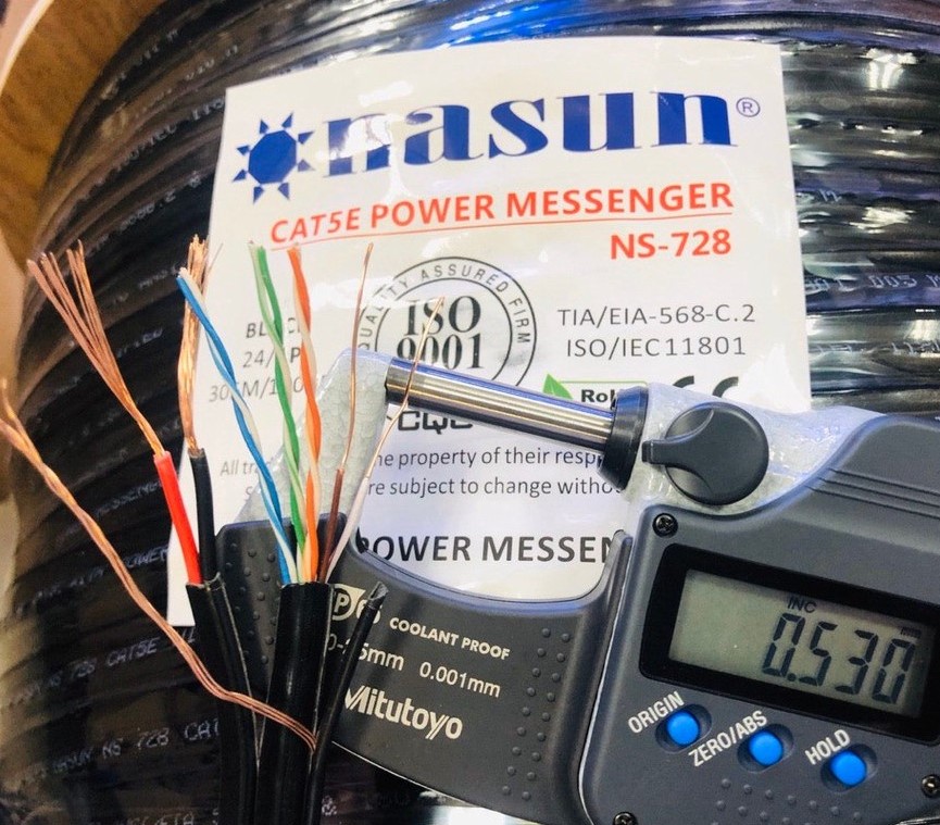 Dây mạng 8 LÕI + POWER Cat5e NASUN NS-728 NHÔM NGUYÊN CHẤT + Nhiều SỢI THÉP GIA CƯỜNG bện chặt, (Hàng chuẩn 305m/Cuộn GỖ) - POWER 2C*6/0.38mmCCA - Đường kính lõi 0.53mm CCA.