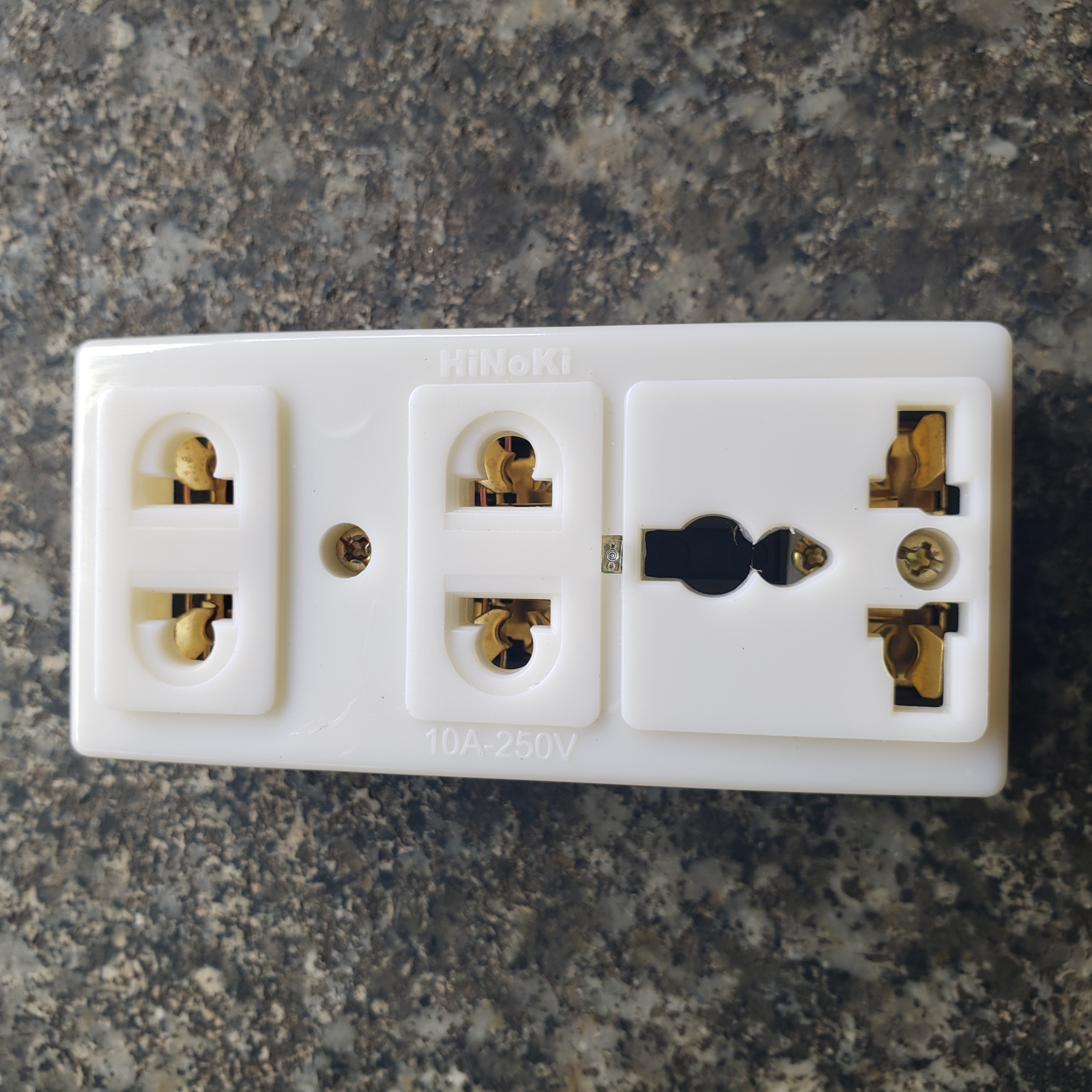 Ổ cắm điện 3 lỗ HiNoki, có kẹp giữ chân đồng. Loại thường.